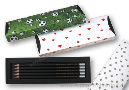 Fünf Bleistifte inklusive Gravur (Name, Logo, Webseite etc.) in einer attraktiven Geschenkverpackung.
